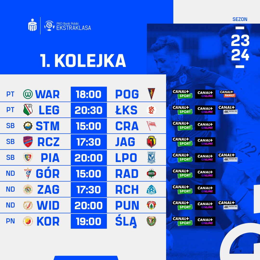 Po blisko dwumiesięcznej przerwie wraca PKO BP Ekstraklasa. Ligowe granie rozpoczniemy od spotkania Warty Poznań z Pogonią Szczecin, a nasze spotkanie z Ruchem Chorzów odbędzie się w niedzielę o 17:30. Zapraszamy na pierwszy w tym sezonie plan transmisji całej kolejki.