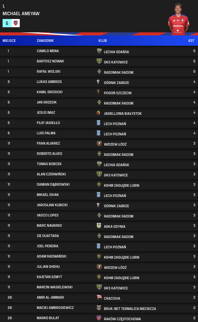 Asystenci po 17. kolejce PKO BP Ekstraklasy