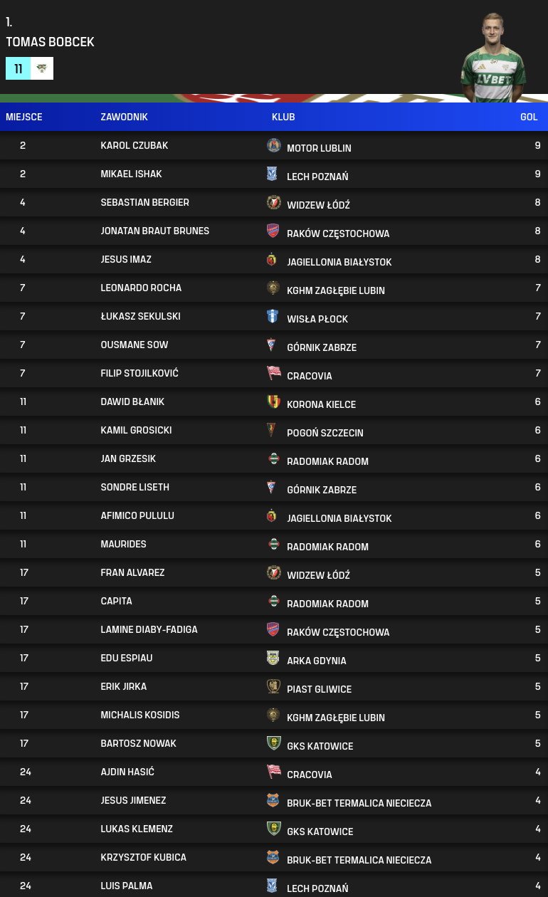 Strzelcy bramek po 17. kolejce PKO BP Ekstraklasy