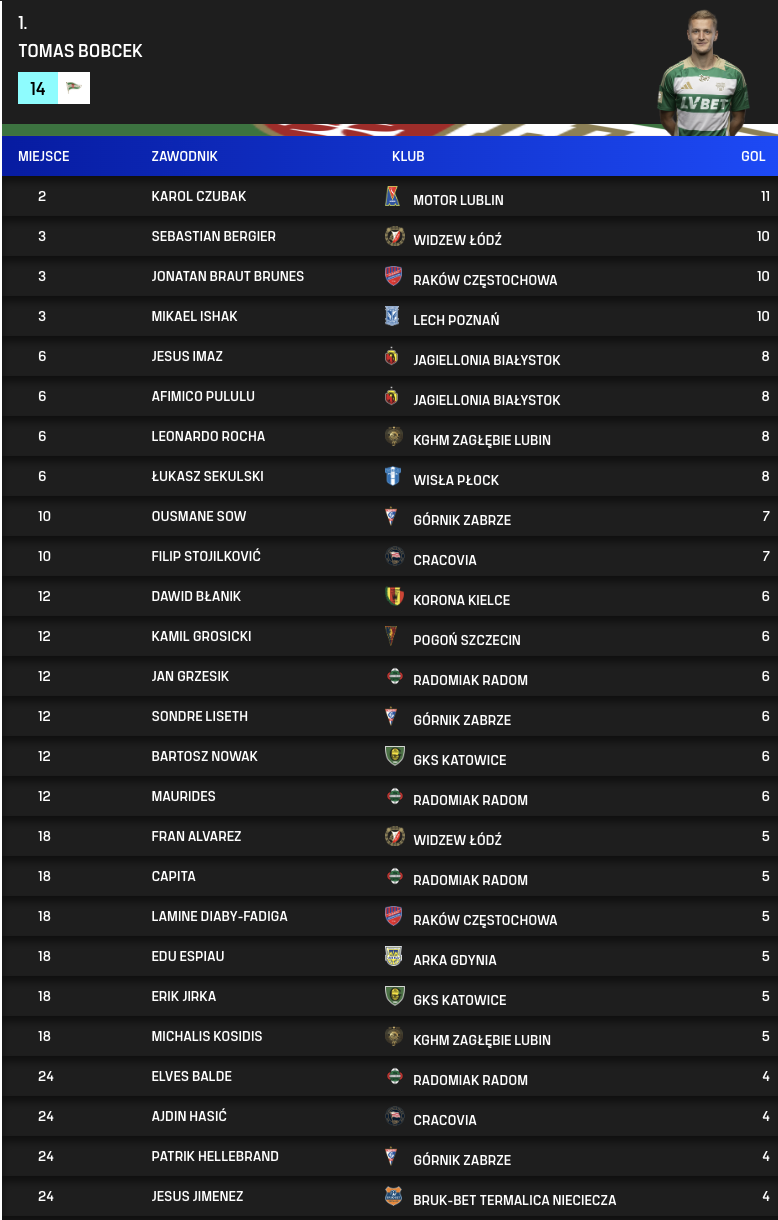 Strzelcy bramek po 19. kolejce PKO BP Ekstraklasy