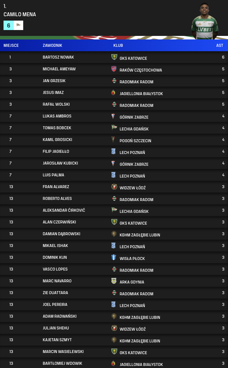 Asystenci po 19. kolejce PKO BP Ekstraklasy