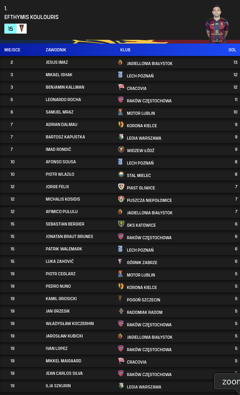Strzelcy bramek po 23. kolejce PKO BP Ekstraklasy