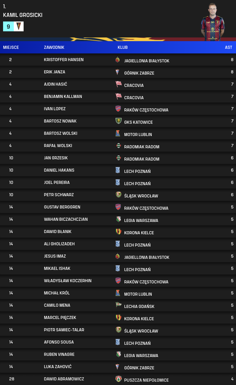 Asystenci po 31. kolejce PKO BP Ekstraklasy