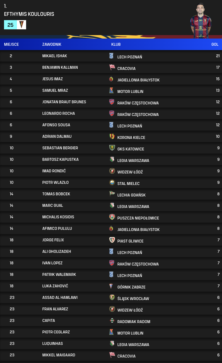 Strzelcy bramek po 31. kolejce PKO BP Ekstraklasy