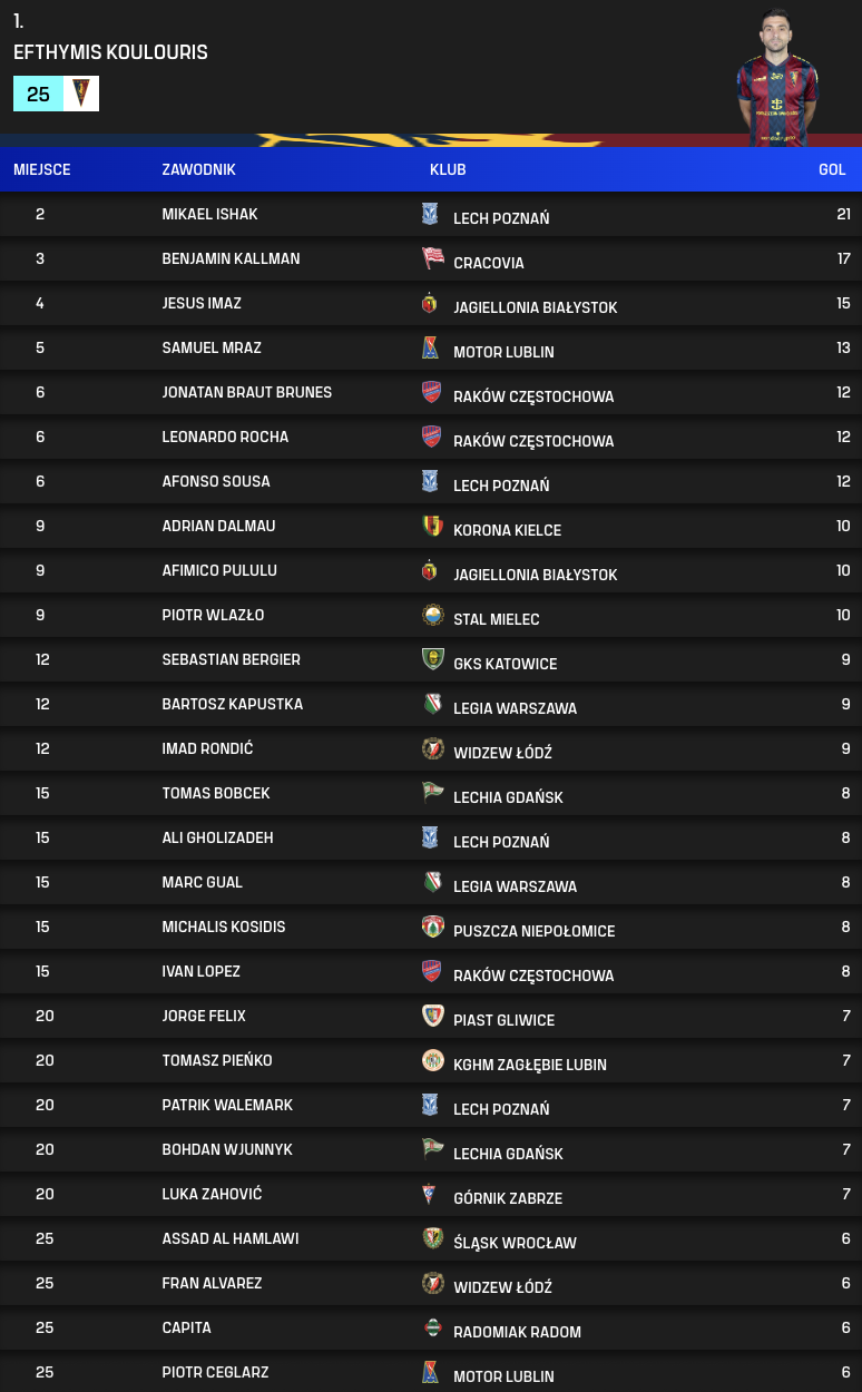 Strzelcy bramek po 32. kolejce PKO BP Ekstraklasy