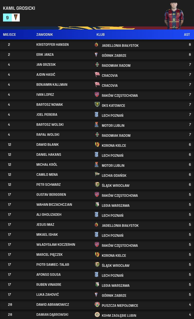 Asystenci po 32. kolejce PKO BP Ekstraklasy