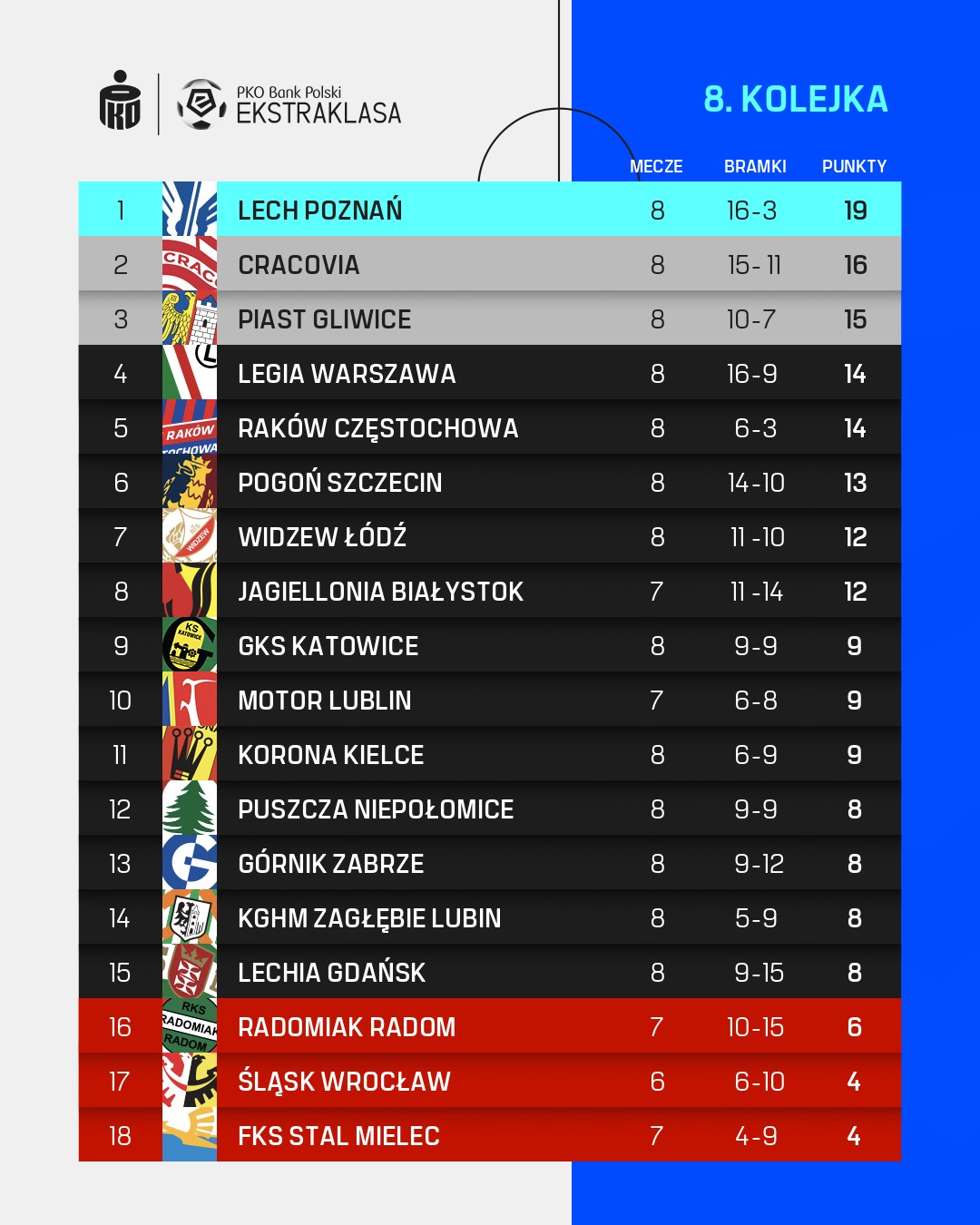 Tabela po 8. kolejce PKO BP Ekstraklasy