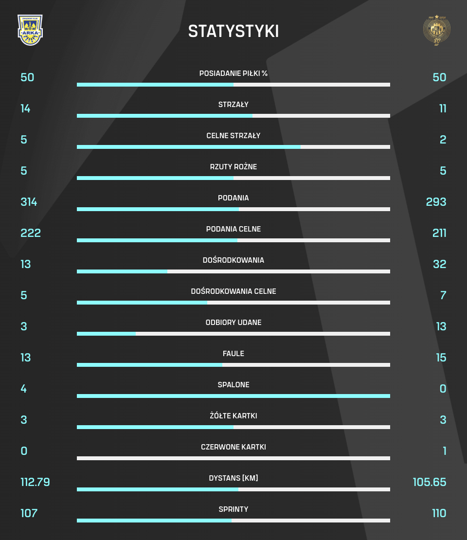 Do Waszego wglądu pozostawiamy statystyki spotkania 27. kolejki, w którym nasza drużyna uległa 1:3 Arce Gdynia.