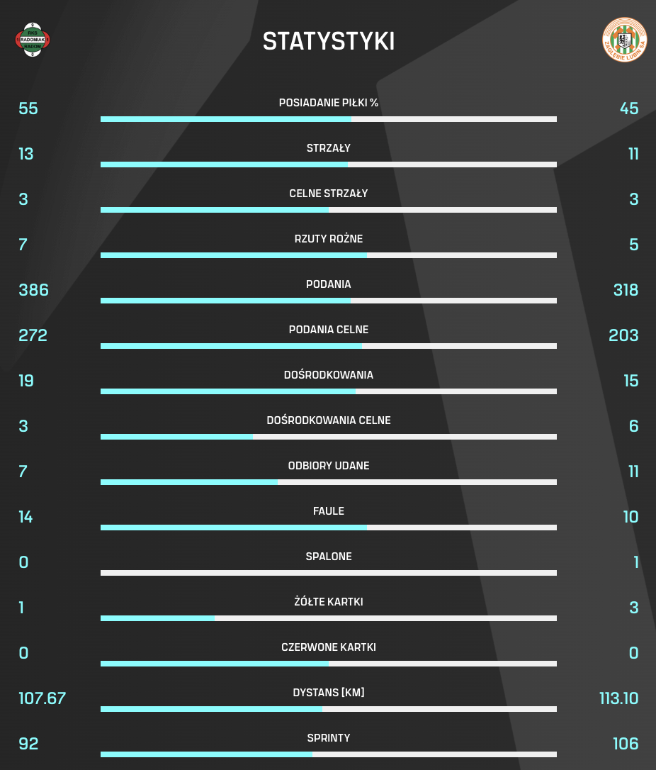 W ramach 27. kolejki PKO BP Ekstraklasy Zagłębie Lubin wygrało na wyjeździe z Radomiakiem Radom 1:0. Poniżej prezentujemy statystyki z tego spotkania – zapraszamy do zapoznania się z liczbami, które oddają przebieg meczu.