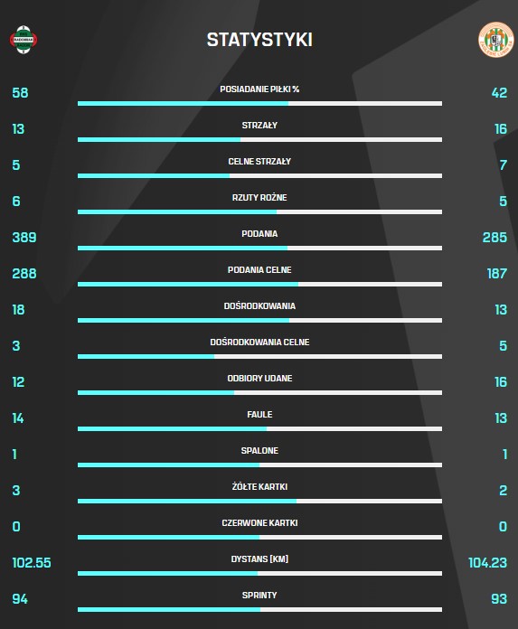 Prezentujemy statystyki niedzielnego meczu 30. kolejki PKO BP Ekstraklasy, w którym Zagłębie Lubin pokonało na wyjeździe 4:3 drużynę Radomiaka Radom.