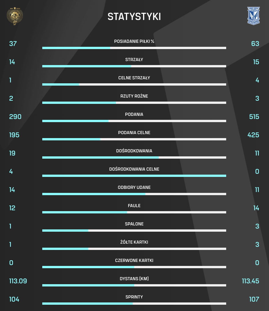 Prezentujemy statystyki niedzielnego meczu 25. kolejki PKO BP Ekstraklasy, w którym Zagłębie Lubin uległo na własnym obiekcie 0:1 Lechowi Poznań.