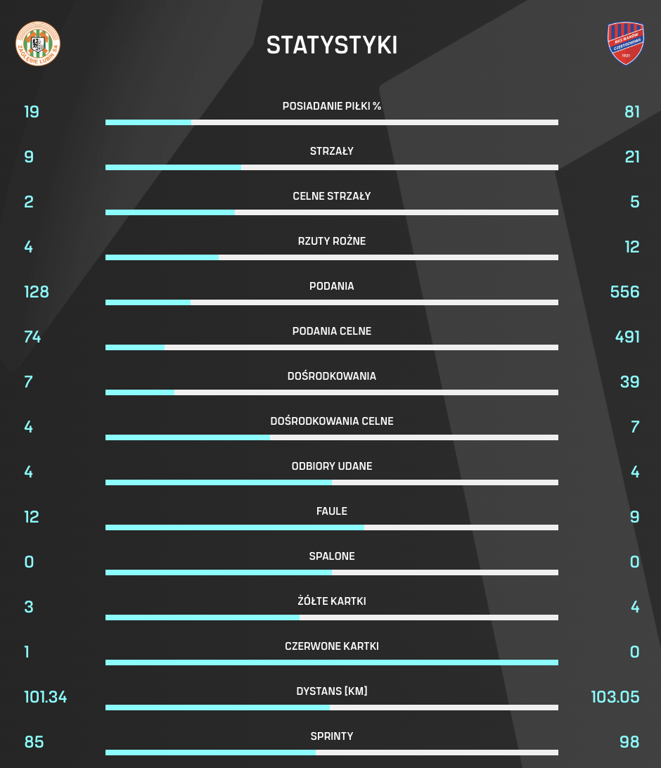 Polecamy Waszej uwadze statystyki poniedziałkowego meczu Zagłębia Lubin z Rakowem Częstochowa, który zakończył się wygraną gości 2:0.