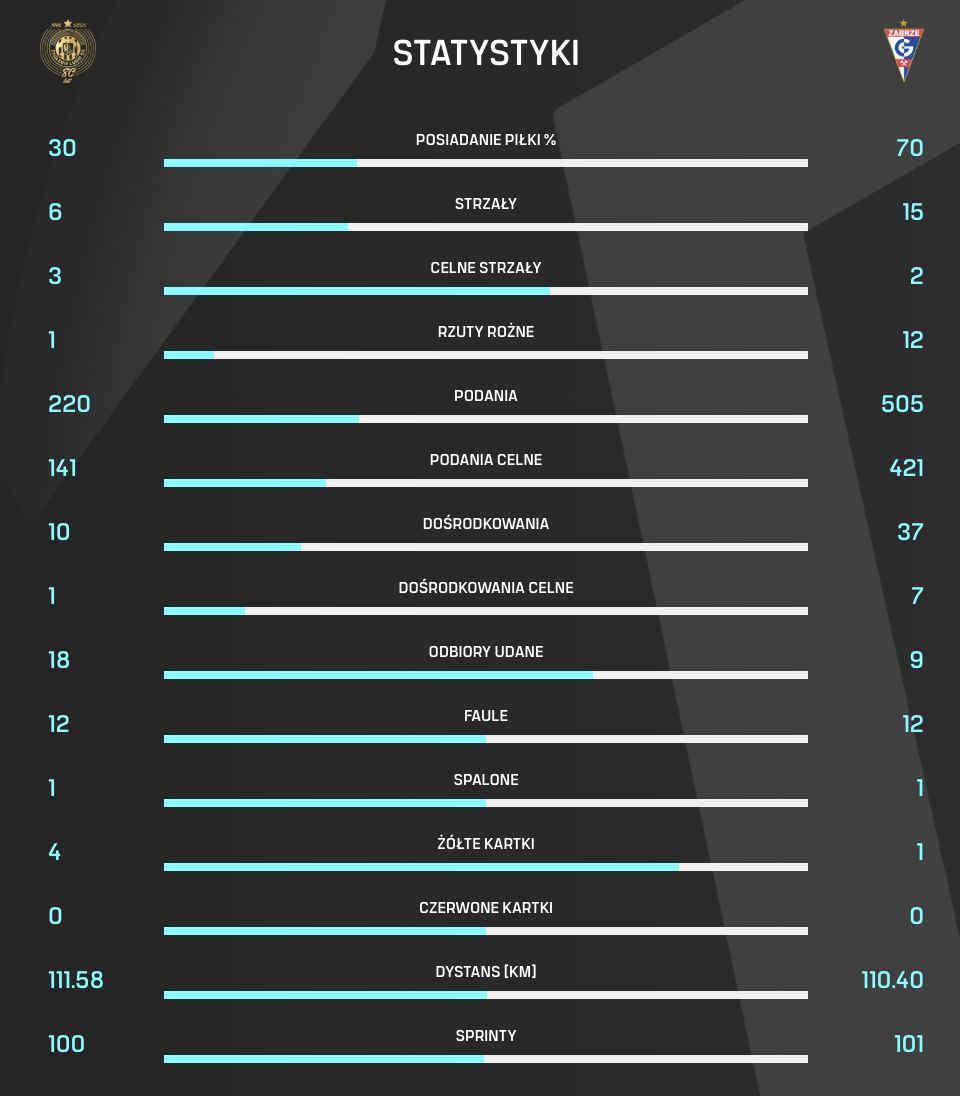 Zapraszamy do zapoznania sie ze statystykami po spotkaniu 15. kolejki PKO BP Ekstraklasy, w którym Zagłębie Lubin pokonało drużynę Górnika Zabrze 2:0.